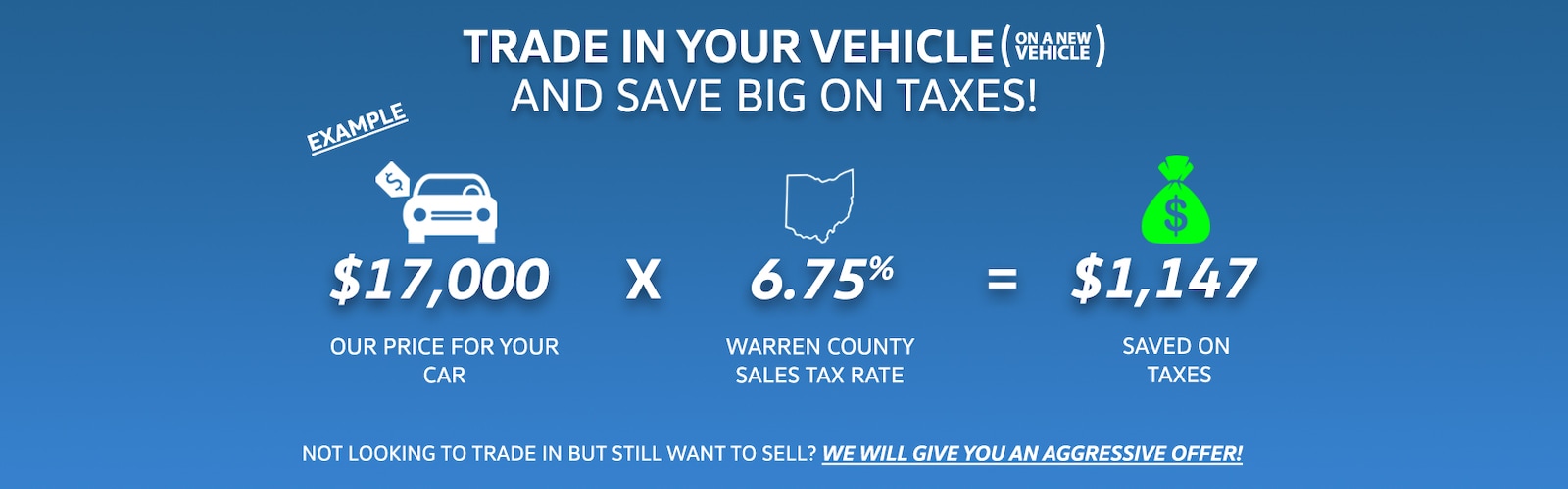 Tax Savings Disclaimer: example above based on the minimum combined 2021 sales tax rate for Warren County, Ohio is 7.0%. This is the total of state and county sales tax rates. The Ohio state sales tax rate is currently 5.75%. The Warren County sales tax rate is 1.25%. To get Tax Savings, customer must trade in on new vehicle. Leases do not qualify. Tax saving figure savings based on customer residence during time of trade in purchase. See dealer for full details.