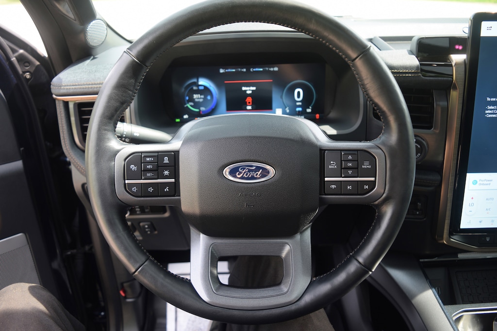 - Radio: B&O Sound System by Bang & Olufsen, Automatic temperature control, Front dual zone A/C, Forward Sensing System, Memory seat, Pedal memory, Power Tilt/Telescoping Steering Column w/Memory, Fully automatic headlights, Heated door mirrors, Active Park Assist 2.0, Ford BlueCruise 1.0, Leather-Trimmed Heated & Ventilated Seats, SYNC 4A w/Enhanced Voice Recognition, Navigation System, 2nd Row Heated Seats, Twin Panel Moonroof, Pro Trailer Backup Assist, Pro Trailer Hitch Assist, Trailer Brake Controller, Rain-Sensing Wipers